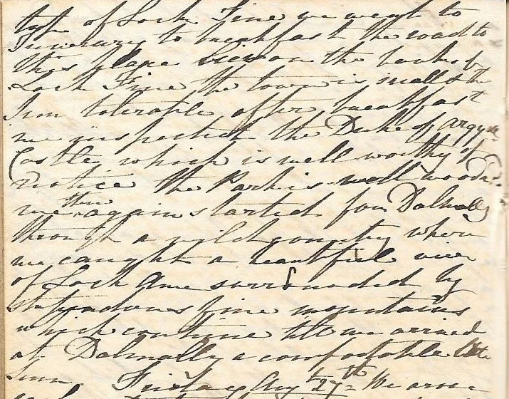 top of Loch Fine we went to Inverary to breakfast the road to this place lies on the banks of Loch Fine the town is small and the Inn tolerable after breakfast we inspected the Duke of Argyll’s castle which is well worthy of notice the park is well wooded we then again started for Dalmally through a wild country where we caught a beautiful view of Loch Awe, surrounded by stupendous fine mountains which continue till we arrived at Dalmally a comfortable little Inn